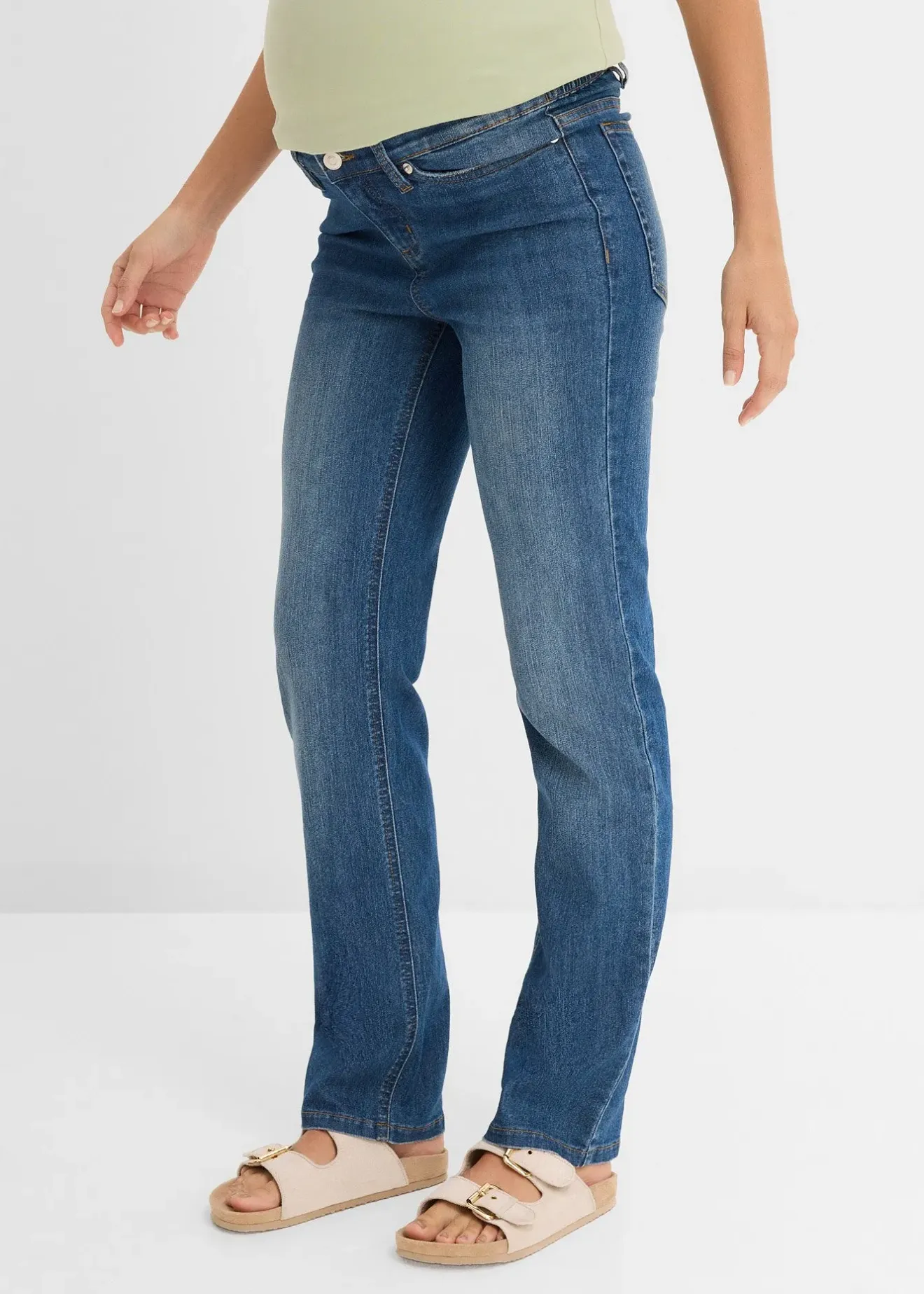 Jean extensible 5 poches pour la grossesse et après, coupe droite. Taille basse avec élastique réglable à l’intérieur pour pouvoir continuer de le porter après la grossesse. Coupe droite et ample.