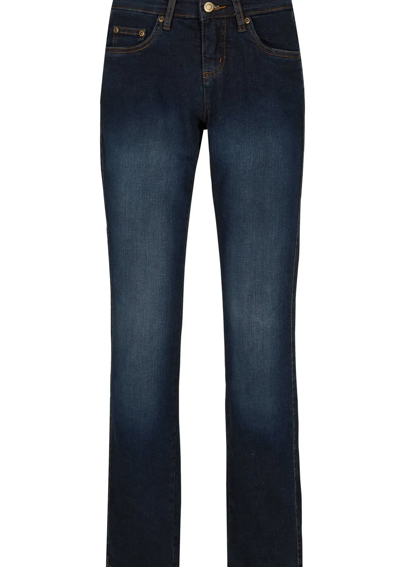 Jean extensible de la marque John Baner avec coutures avancées devant pour un effet amincissant. Taille mi-haute, style 5 poches, ampleur cuisses classique, jambes droites. Modèle facile à combiner avec de jolis hauts et des chaussures à talons.