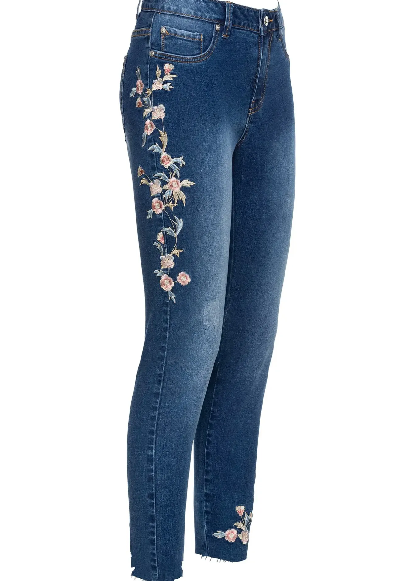 Jean cinq poches original de la marque BODYFLIRT. Broderie florale sur les jambes et finition légèrement effilochée à la base.