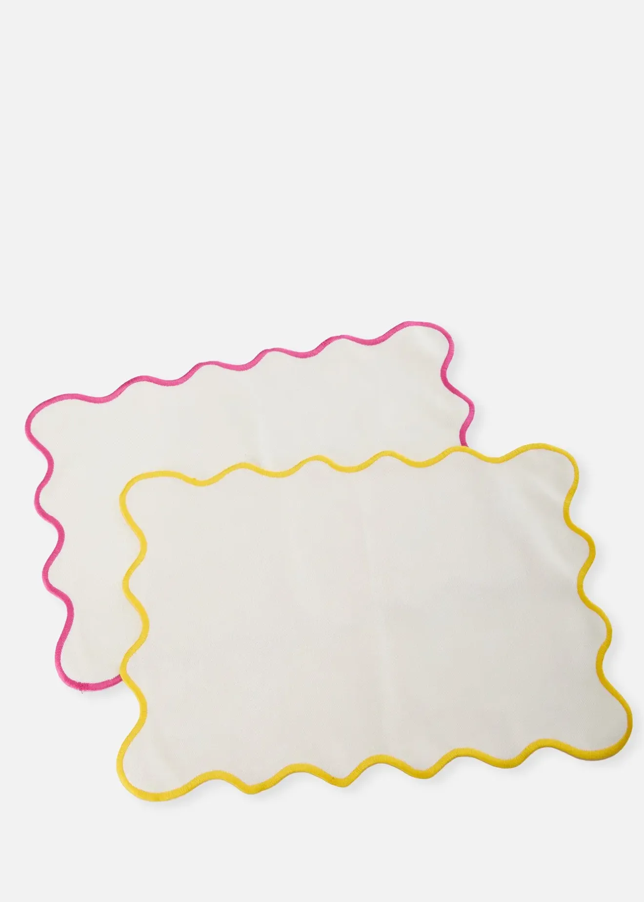 Avec ces deux sets de table colorés, votre salle à manger attire immédiatement tous les regards. Un avec bord ondulé jaune, l’autre rose. Le plus intéressant ? Il suffit de les retourner pour changer de style entre blanc pur classique ou crème discret. Apportez dès maintenant une touche de dynamisme à votre table !