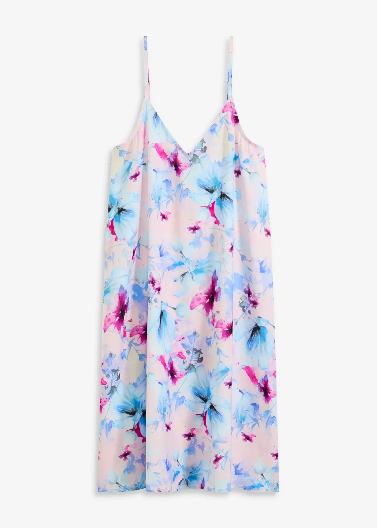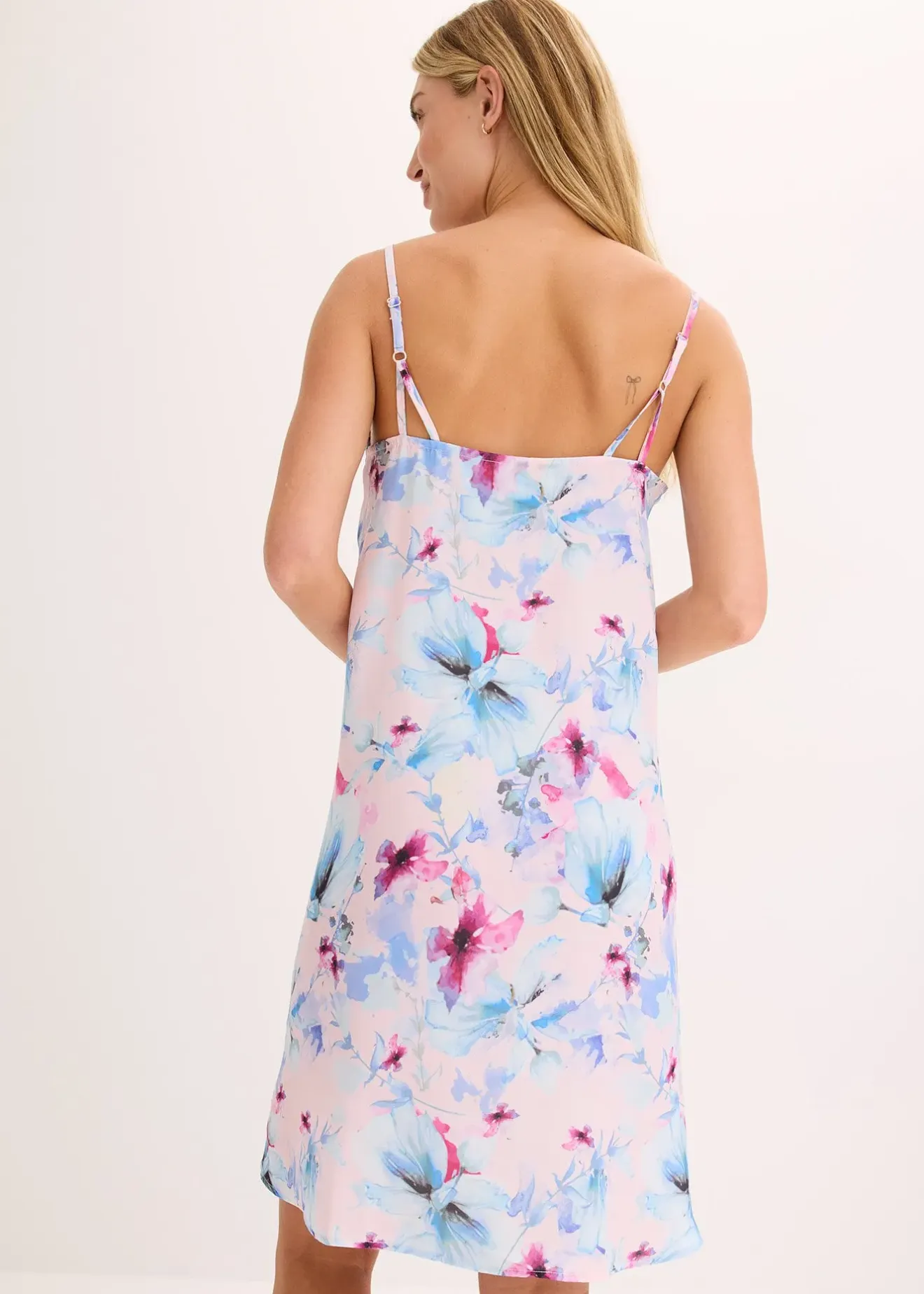 Nuisette en satin, forme trapèze, avec une fente sur le côté et un imprimé floral et féminin