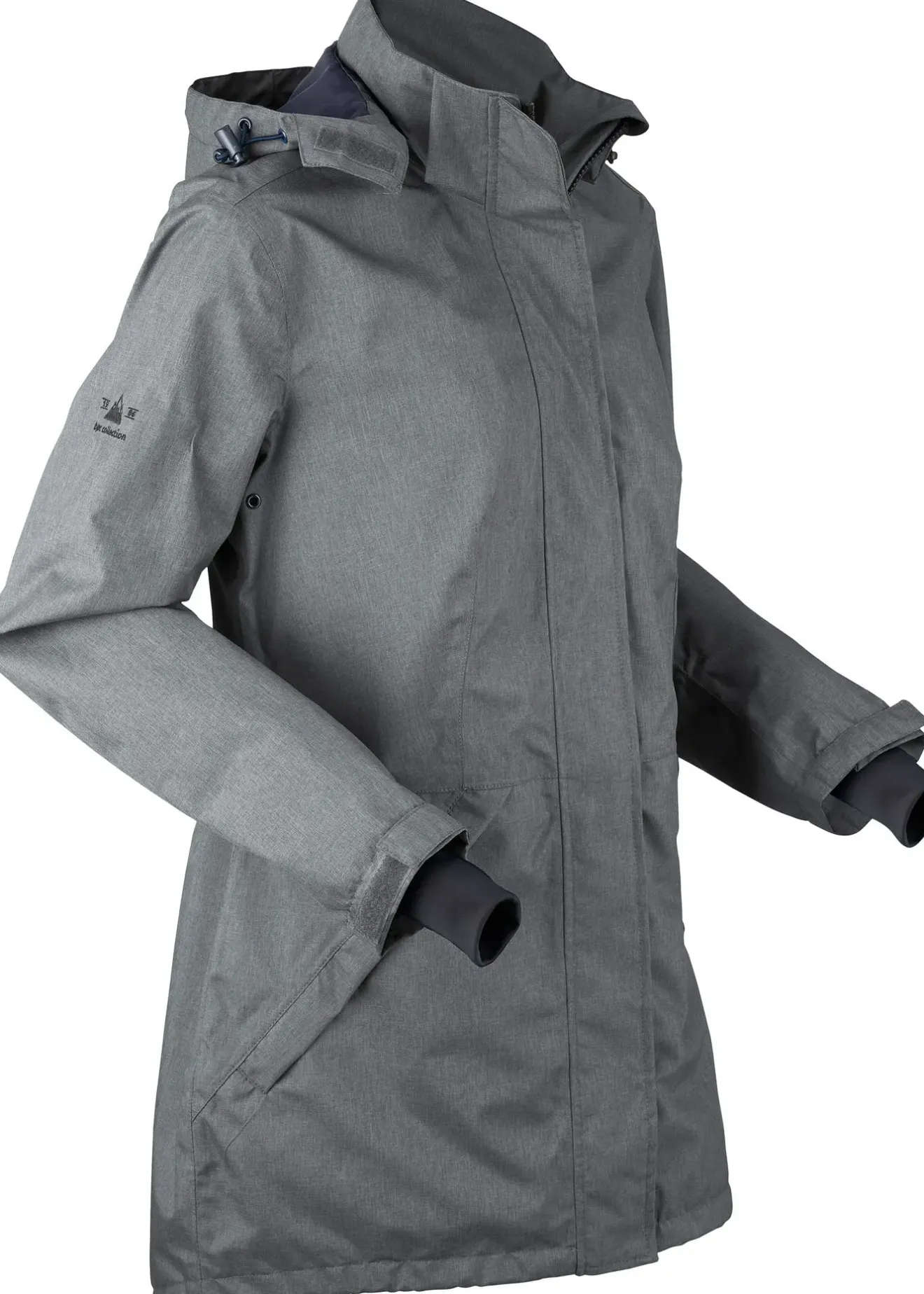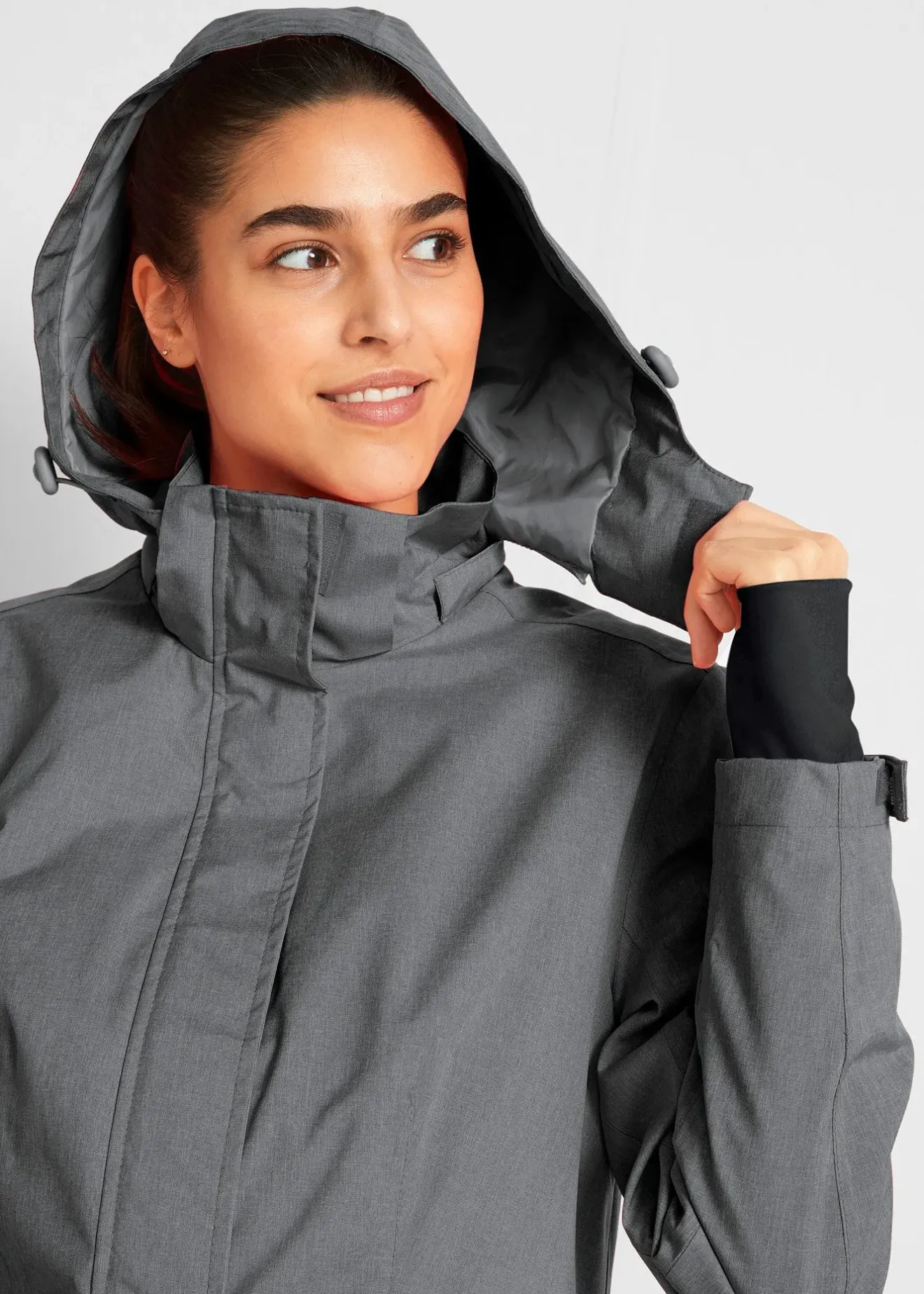 Capuche amovible, poches zippées, mitaines, fermeture zippée avec protège-menton, ampleur réglable à la taille, poche intérieure avec sortie pour câble d’écouteurs, colonne d’eau 3000 mm, long. env. 90 cm.