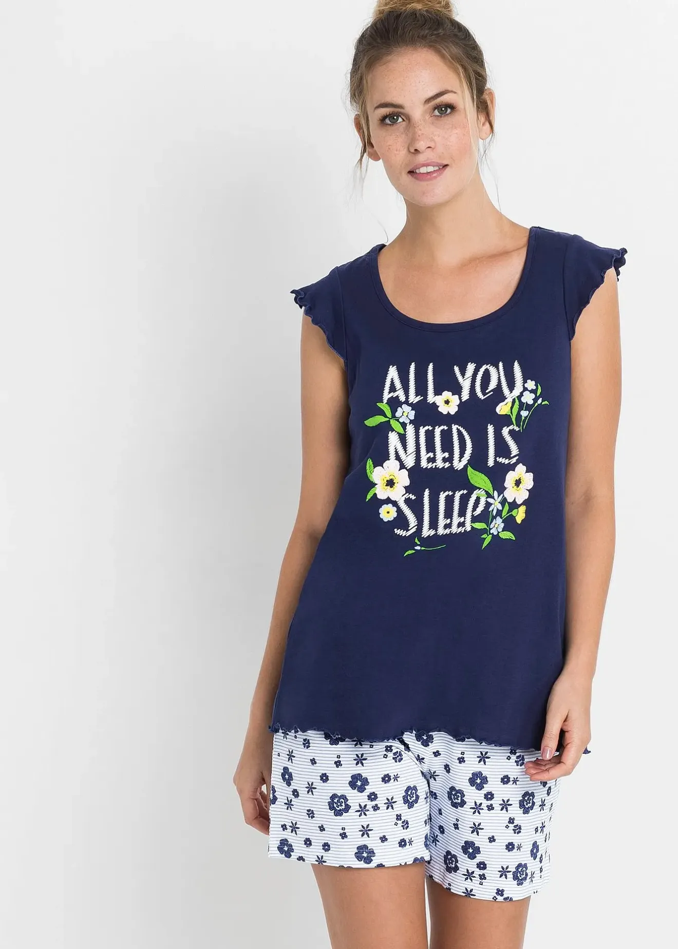 Pyjama doux comprenant un short imprimé et un T-shirt manches courtes et col rond. La forme trapèze évasée et les manches papillon du T-shirt apportent une touche féminine.