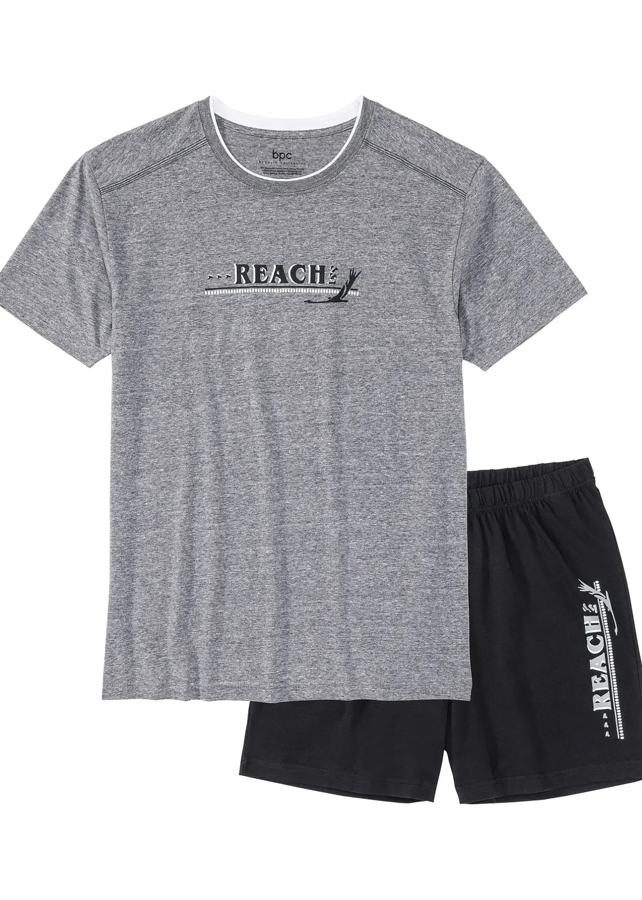 Pyjashort sportif 2 pièces 100% coton pour homme de la collection bpc. T-shirt à inscription sur la poitrine, col en double épaisseur, short ample à taille élastiquée et motif imprimé sur le côté.