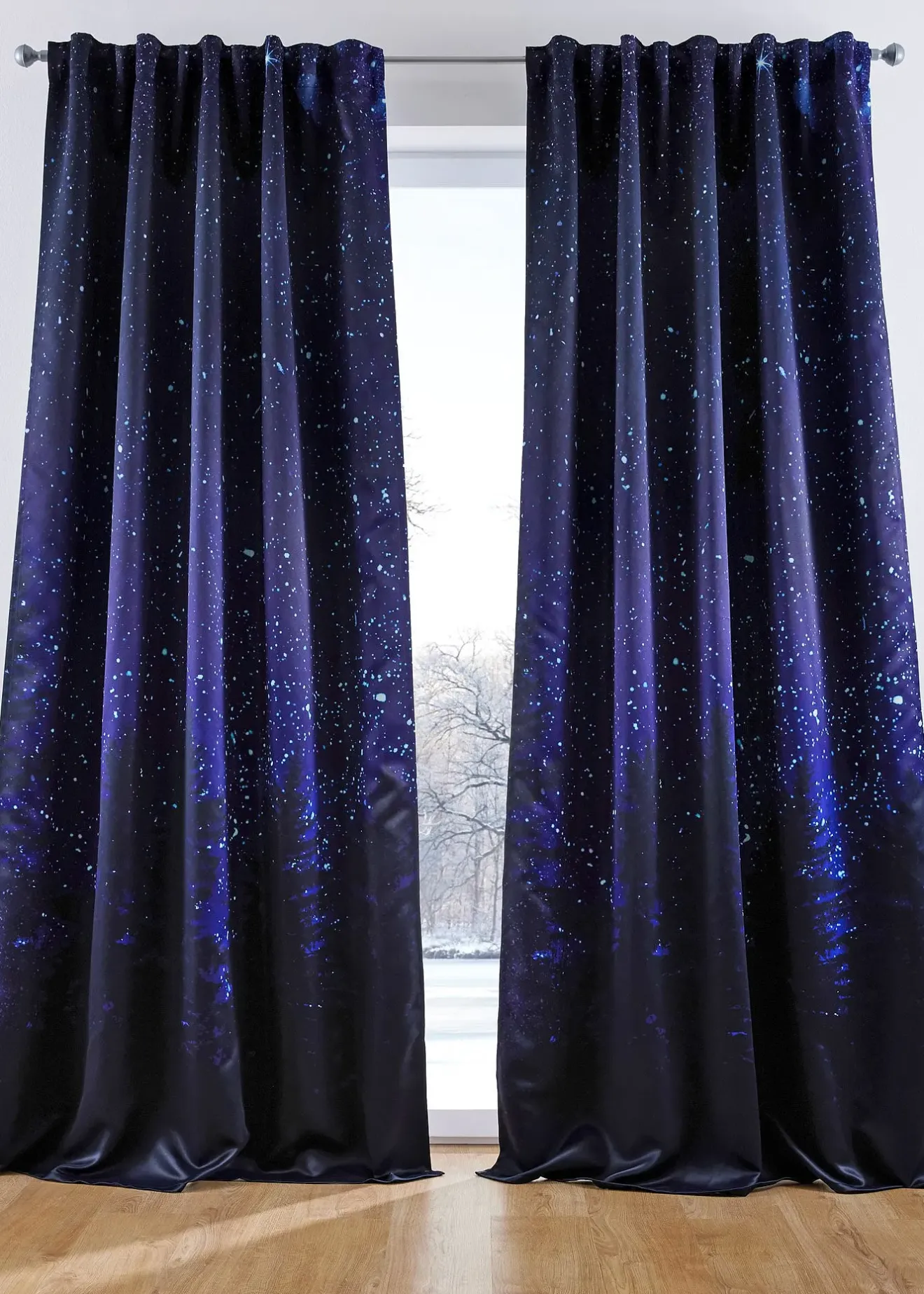 Rideau obscurcissant moderne avec un superbe imprimé de ciel étoilé sur le devant. Arrière clair et sans imprimé. Allie design et fonctionnalité, car son tissu lourd et occultant peut faire économiser de l’énergie. Empêche les courants d’air en hiver et lutte contre la chaleur en été.