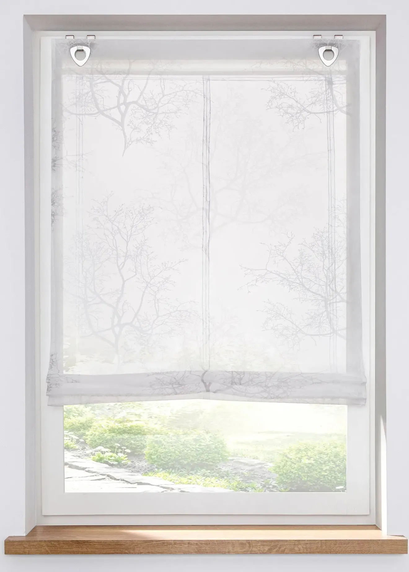 Store bateau transparent, voile, imprimé, œillets, pose sans perçage ni vissage – crochets à fixer directement sur le cadre de la fenêtre (épaisseur jusqu’à 2 cm). Dimensions = dimensions du tissu.