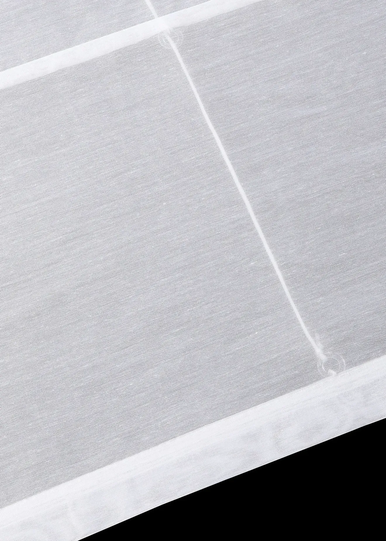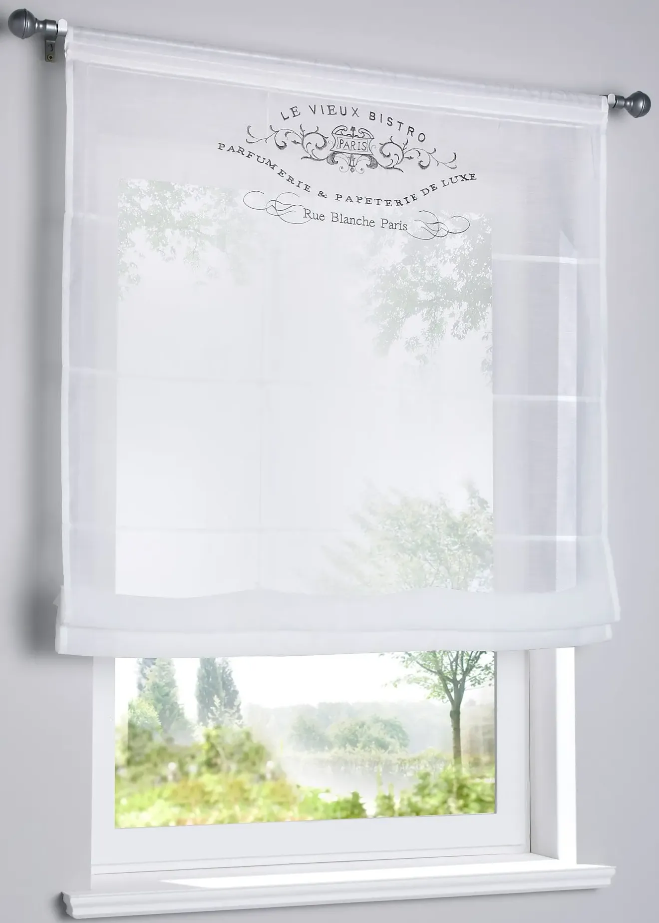 En voile transparent, imprimé et coutures décoratives, facile d’entretien, accessoires et deux barres de lestage inclus (pour lester à la base et pour fixer la partie supérieure), dimensions = dimensions du tissu, accrochage par coulisse passe-tringle.