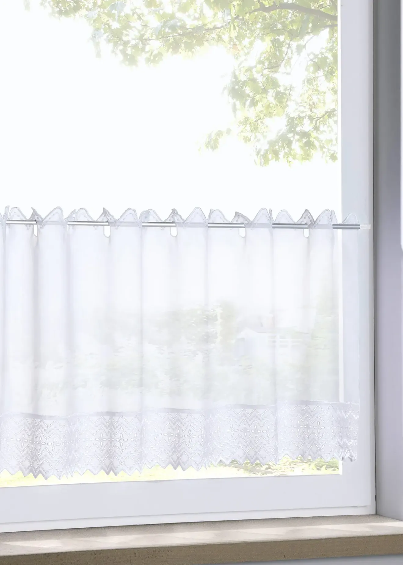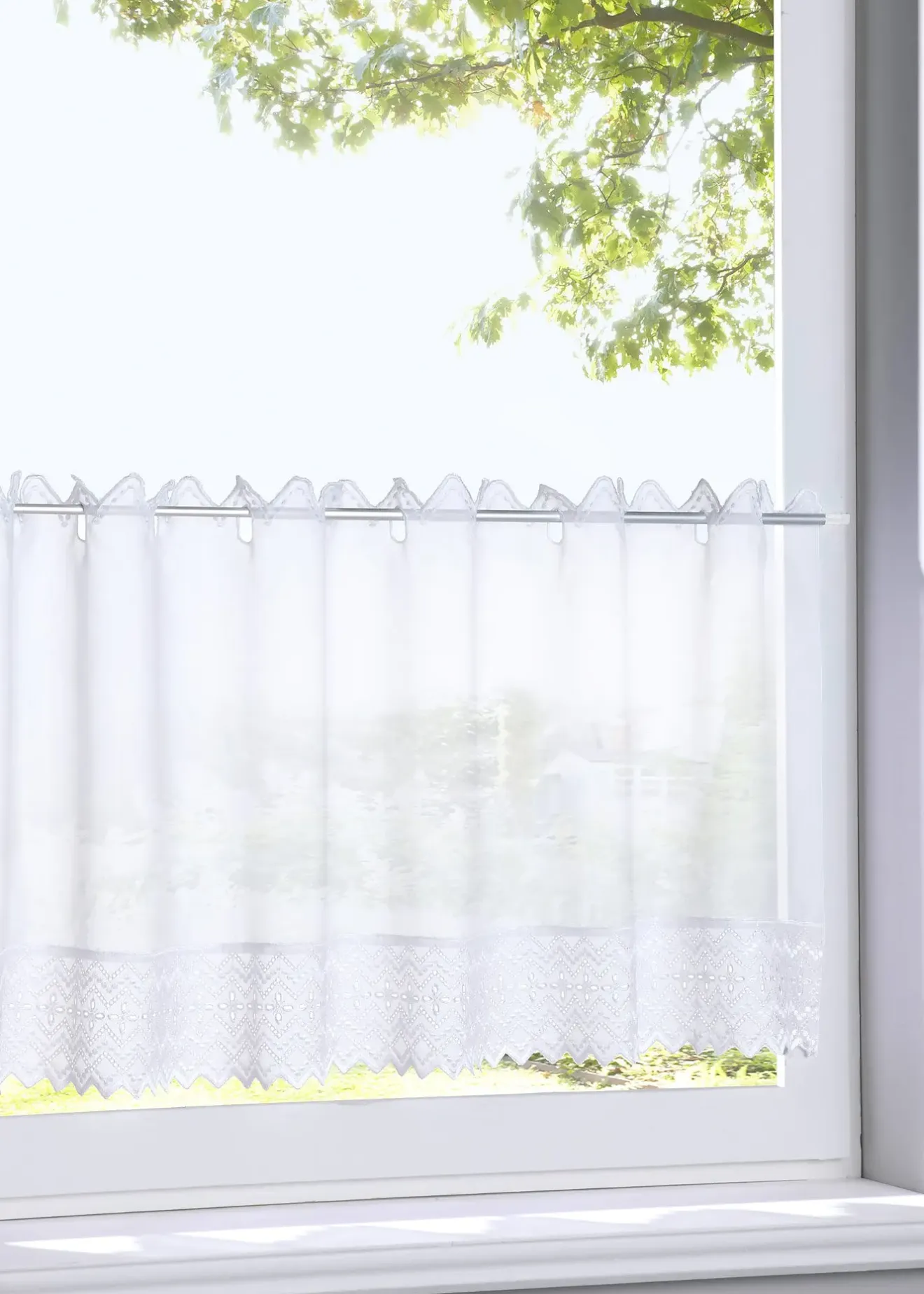 Brise-bise discrète avec une bordure brodée pour votre fenêtre de cuisine. Ses œillets passe-tringle assurent une pose simple et rapide sur une tringle télescopique. Pour tringles d’un diamètre max. de 3 cm.