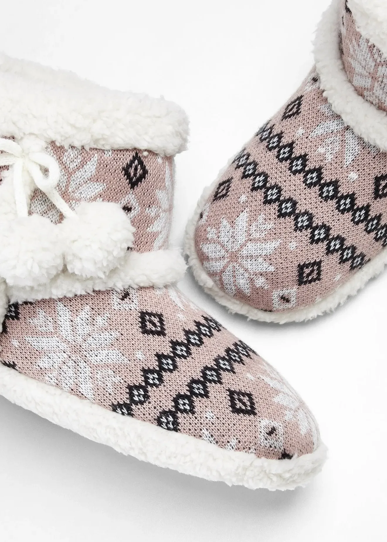 En textile à motif hivernal avec deux pompons décoratifs sur la tige.