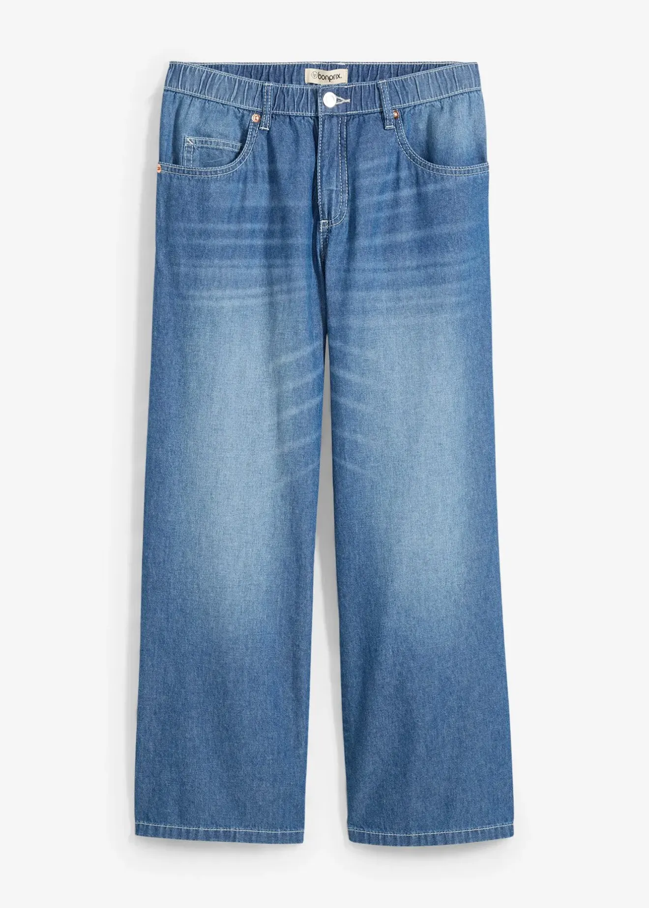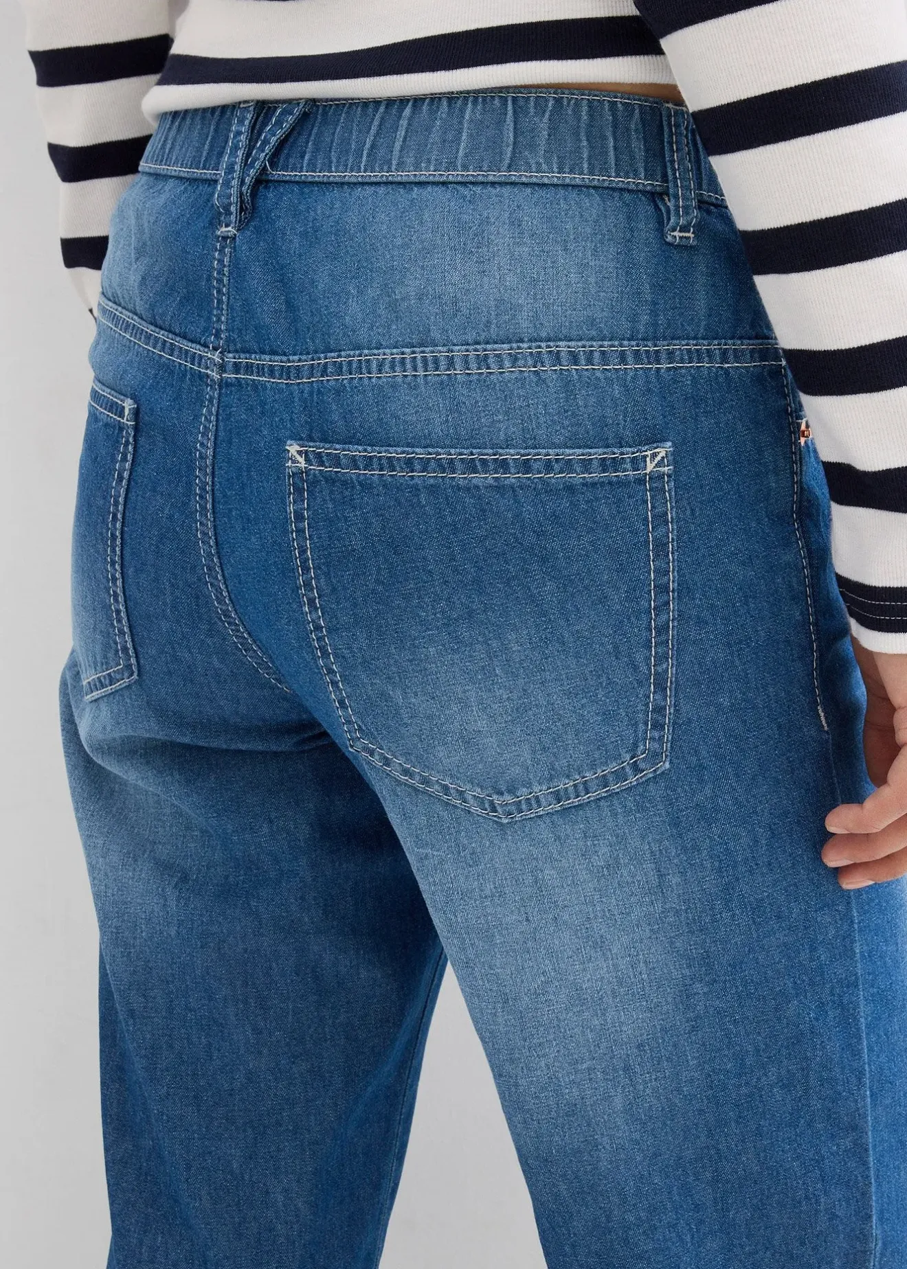 Jeans 5 poches droit décontracté avec une ceinture élastiquée. En coton denim solide un peu rigide au début mais progressivement plus souple lorsqu’il est porté souvent. Taille mi-haute avec fausse braguette et bouton. Longueur raccourcie. Long. entrejambe env. 64,5 cm, lavage machine.