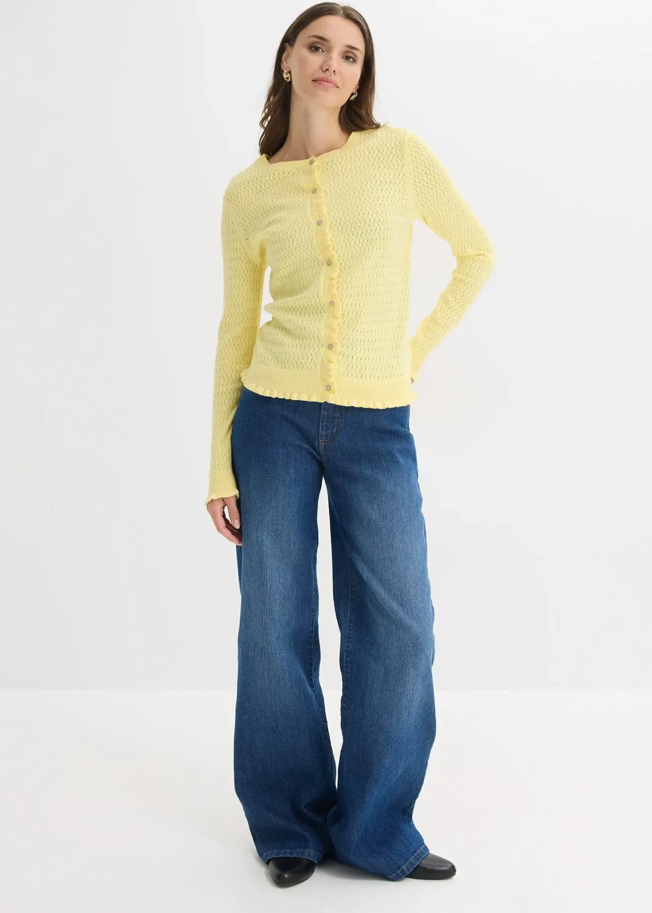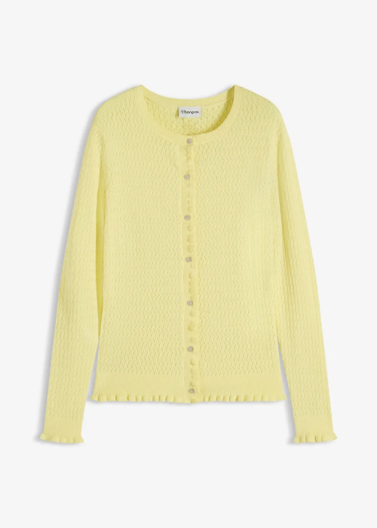 Gilet en maille moderne avec des petits volants à la base, aux poignets et le long de la patte de boutonnage