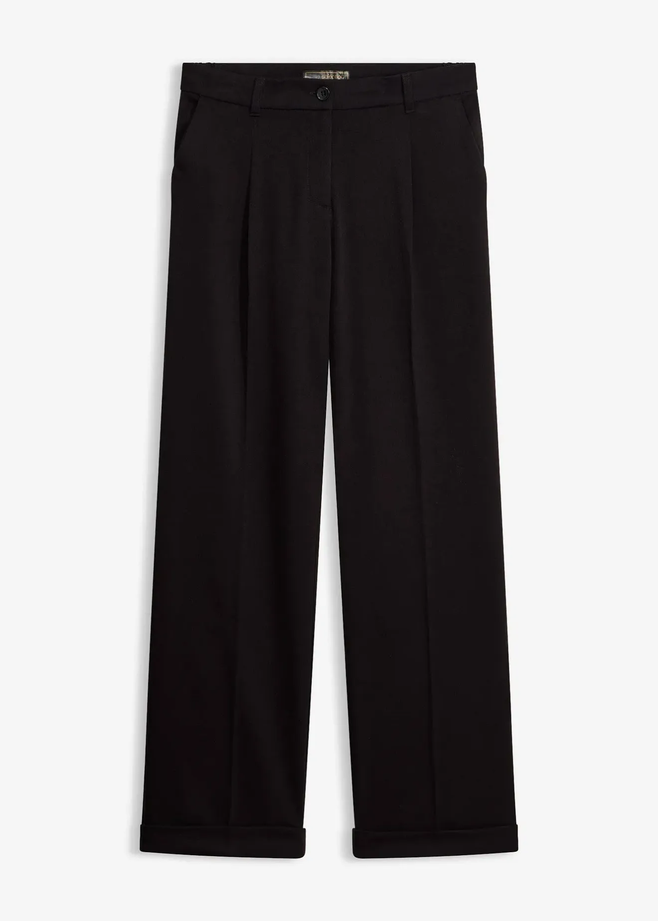 Pantalon à pinces à la taille, coupe ample, flatteuse pour la silhouette, en matière douce fluide, deux poches latérales, 2 poches passepoilées au dos, 5 passants de ceinture, jambes larges à plis repassés avec petit revers, long. entrejambe env. 78,5 cm, lavage machine.