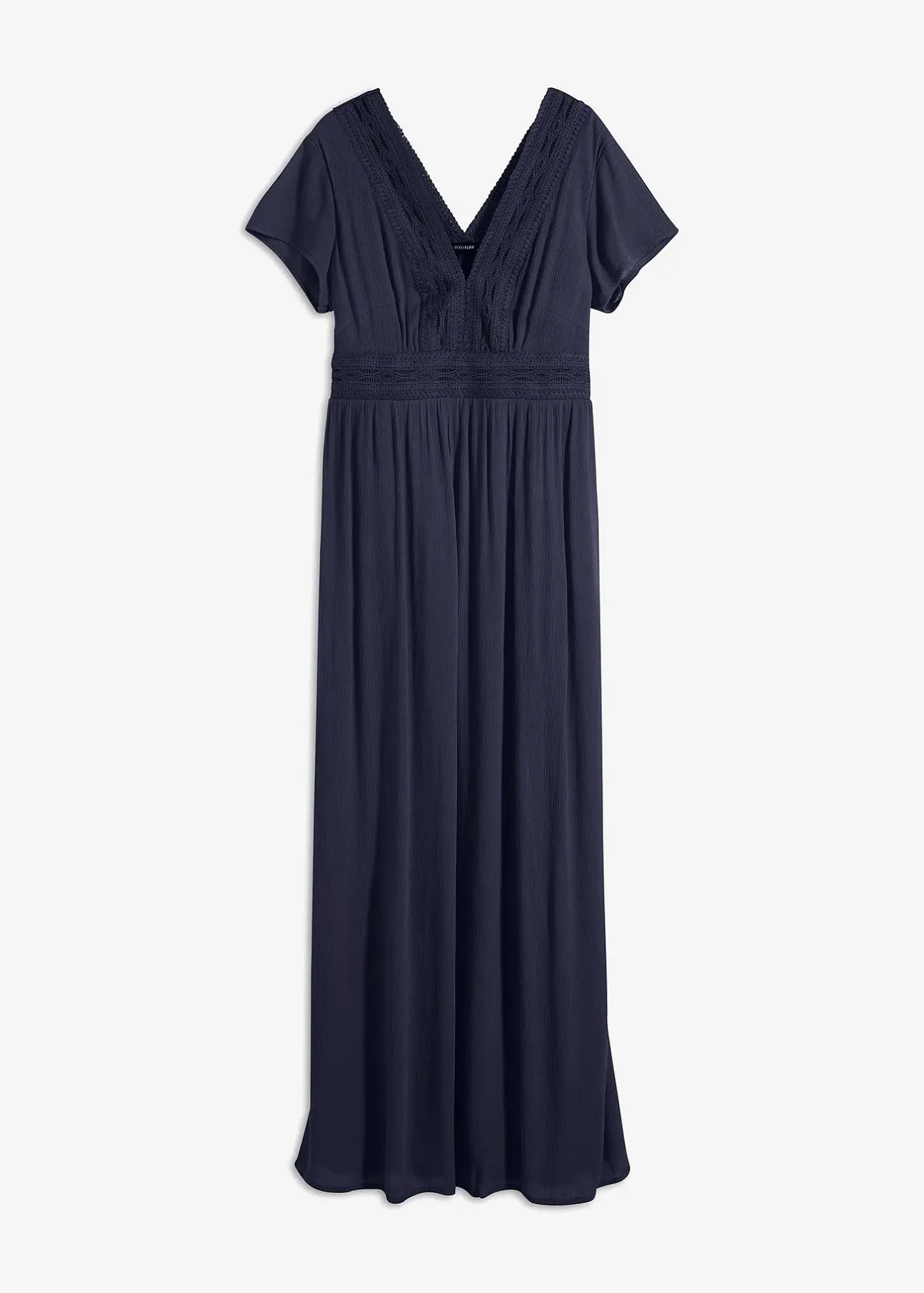 Magnifique robe longue à empiècement en dentelle au décolleté devant et dos, et sous la poitrine. Empiècement élastique dans le dos et manches courtes. Long. env. 146 cm.