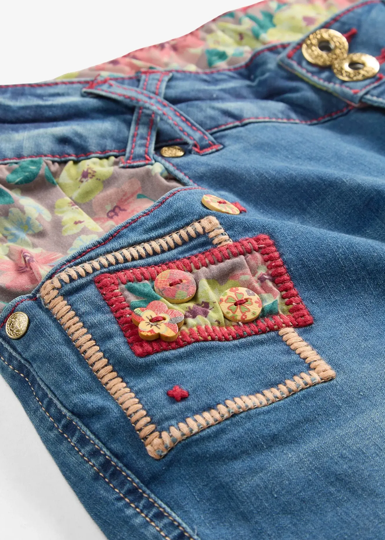 Bermuda en jean cool et taille basse à motifs contrastants. Boutons colorés et empiècements en tissu pour une allure décontractée et moderne.