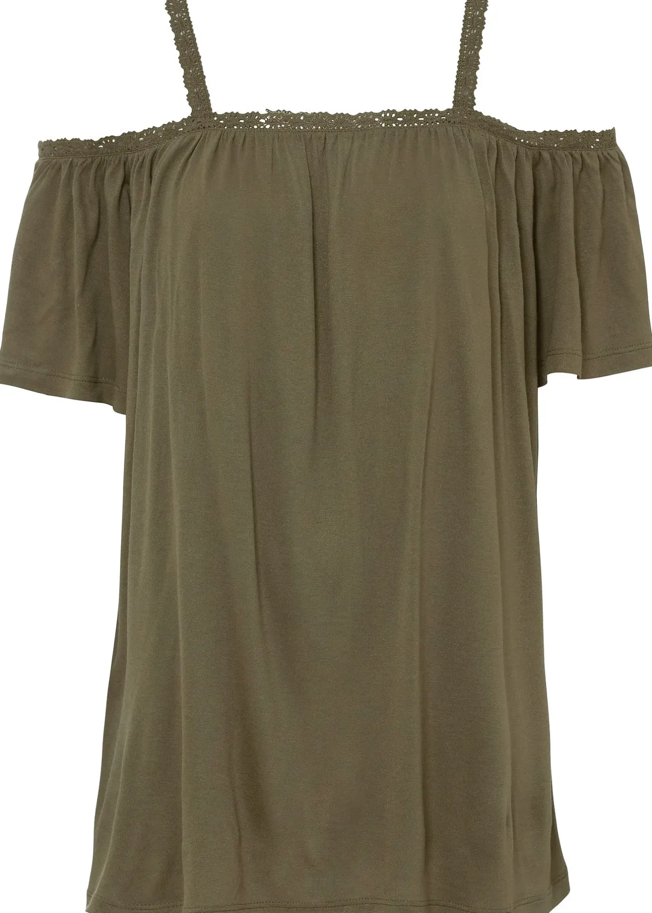 T-shirt stylé à galon en dentelle sur l’encolure et les bretelles, grandes découpes sur les épaules. Légères fronces et coupe décontractée.