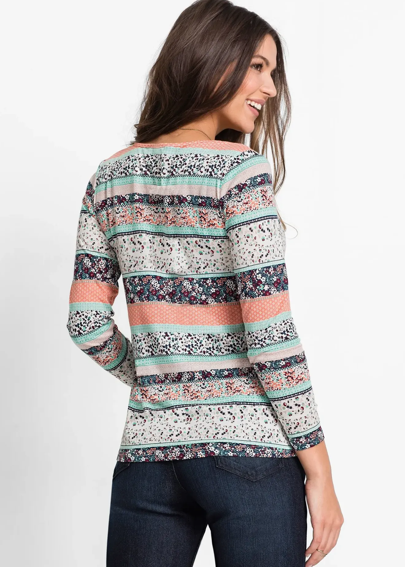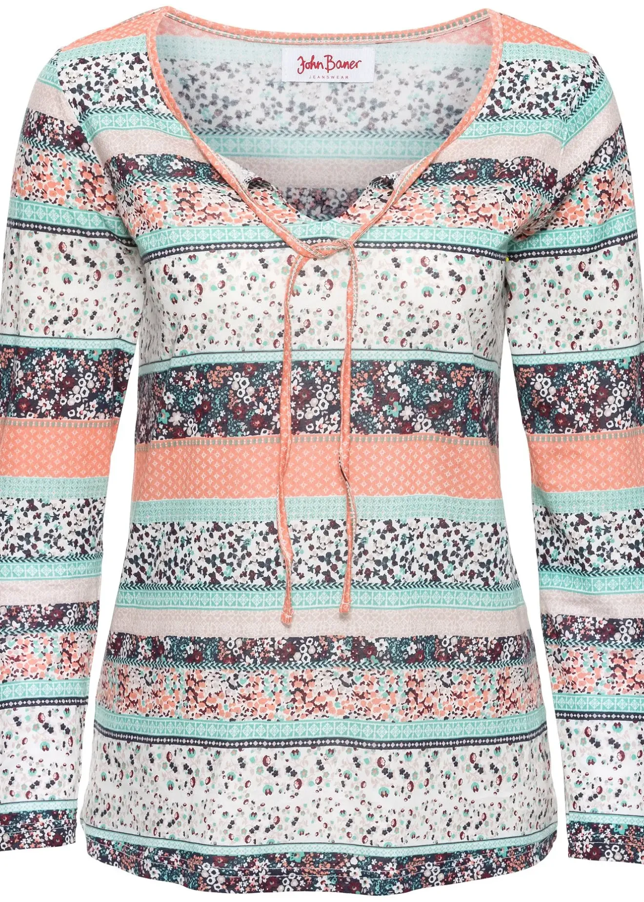 Tunique T-shirt imprimée avec encolure ronde soulignée d’une petite fente en V avec liens à nouer. Long. env. 70 cm, lavage machine.