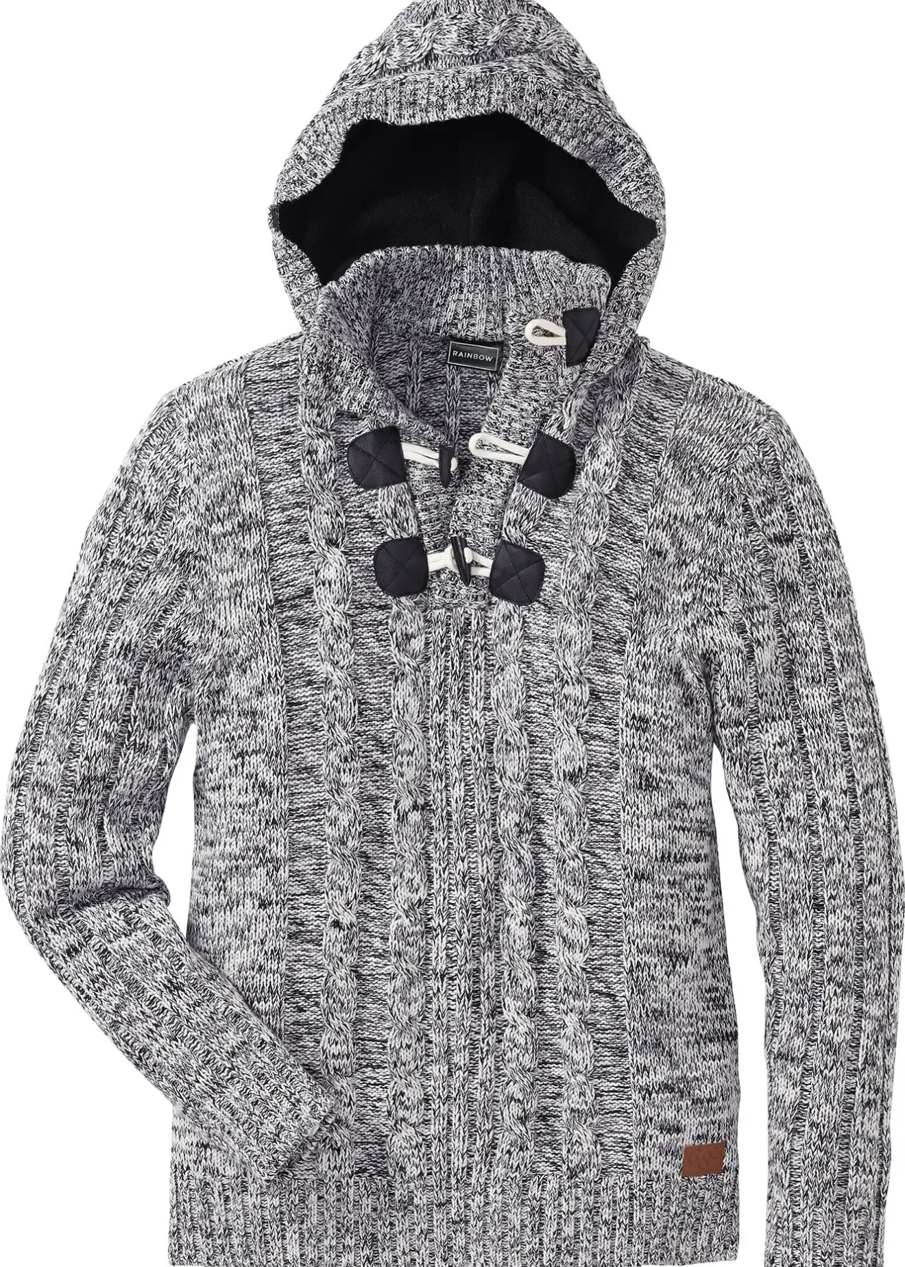 Pull homme Regular de la marque RAINBOW pour la saison froide. Modèle stylé en grosse maille avec capuche mode et col montant à brandebourg. Base avec un patch enduit devant sur le côté. Finitions côtelées aux manches et à la base.