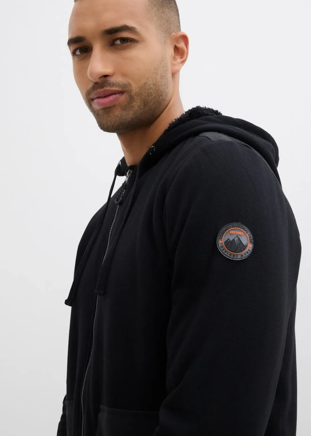 Sweat zippé moderne à capuche avec finitions côtelées et badge sur les manches